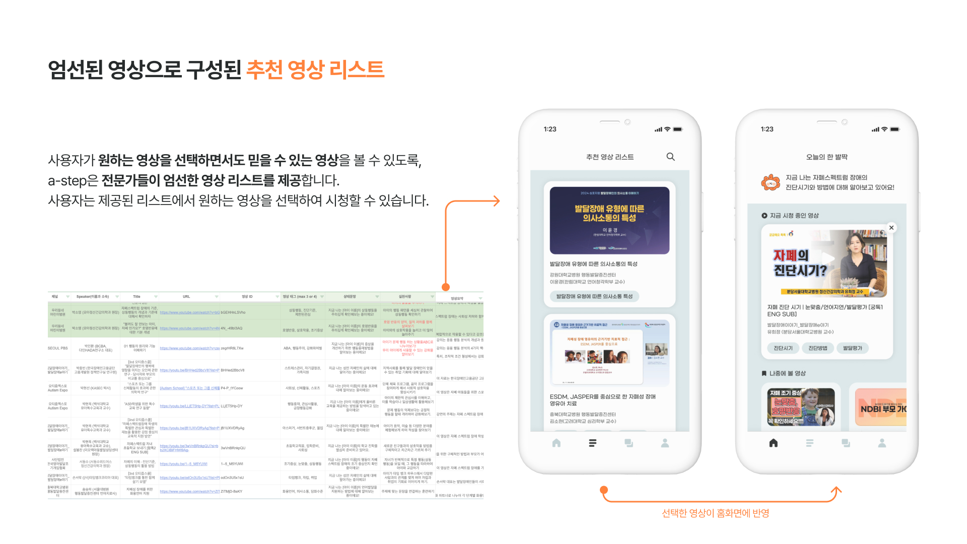 In collaboration with the Jeju National University Hospital Developmental Disability Center, child psychiatrists, and experts in child development, we designed a-step, an application that curates videos carefully selected by professionals. Through the recommended video lists, users can easily find high-quality and trustworthy videos that match their needs and interests. If they are not sure which topics to start with, they can also follow preset curriculums we have created. Finding the right videos is important, but watching them effectively is just as crucial. To support this, we provide key summary notes for each video, created using NotebookLM, and a note-taking feature that allows users to freely write down their thoughts and what they have learned while watching. Through this platform, we aim to help individuals with developmental challenges watch reliable content with confidence and feel less overwhelmed by the vast amount of information available online.